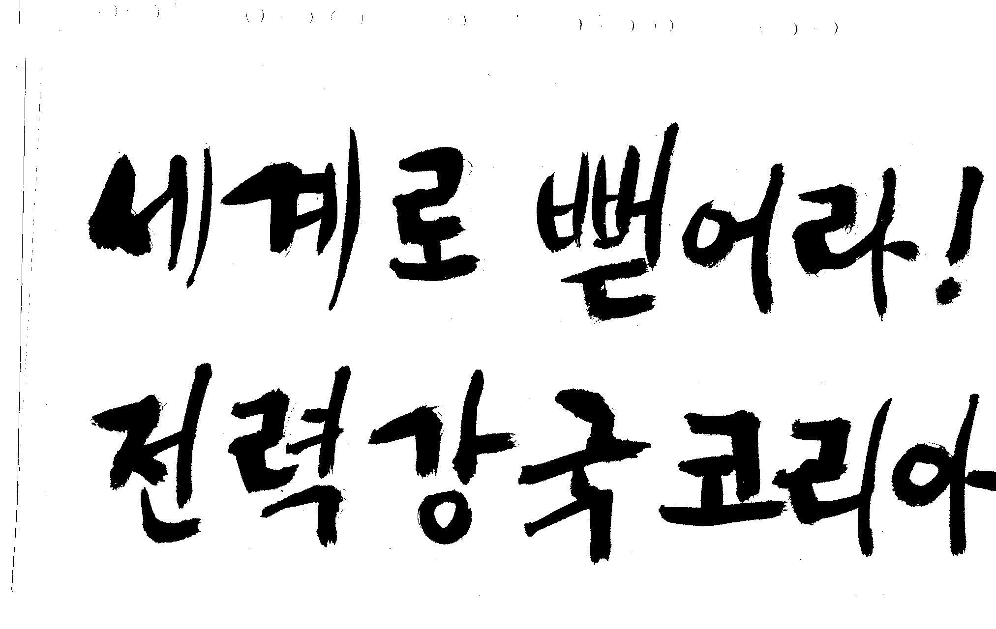 캘리 좀 부탁드려요!~ 김철호 일반 1 10527 2008.12.24 12:09 > > > > > 전력회사 신문광고를 하는데요 캘리로 멋지게 하고픈데 > > 캘리프로그램으로 아무리 써도 느낌이 안나옵니다 ㅜ.ㅜ > > 이런걸 부탁한다는 자체가 너무나도 염치없지만 부탁드립니다. > > > > 세계로 뻗어라! 전력강국 코리아 > > > 보기는 쉬워도 하기는 어려운게 > 세상 모든 일 일겁니다. > 그중에 캘리그라피가 그런것 일 겁니다... > 스캔중에 글꼴이 잘린것은 서로다른글꼴서 편집하시길... > 글수가 많아서 어쩔 수없네요... >